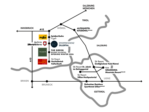 From the east, north: From Munich/Salzburg/Vienna on the A1, A8 and A93 to Kiefersfelden. Continue on the A12 (motorway vignette!) to the Zillertal exit. Then continue on the B169 for approx. 7 km until you reach Fügen.