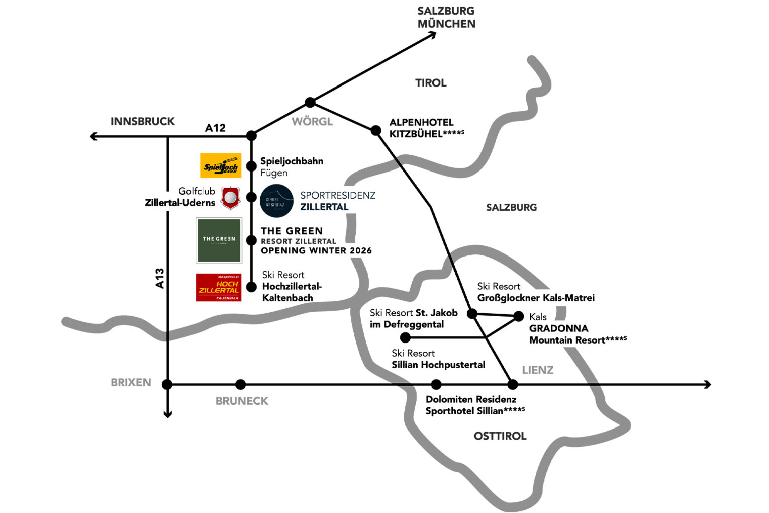 Die Flughäfen Innsbruck (50 km), München (170 km) und Salzburg (150 km) sind in unmittelbarer Nähe des Zillertals und durch tägliche Linienflüge direkt mit Destinationen in ganz Europa verbunden.